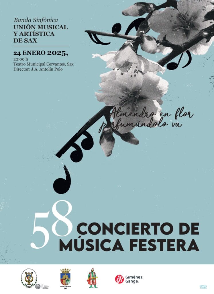 La Unión Musical y Artística de Sax ofrecerá el próximo viernes 24 de enero de 2025 su tradicional concierto de Música Festera a las 22:00 horas en el Teatro Municipal Cervantes de Sax. Cincuenta y ocho son las ediciones que la banda sajeña pone música festera en los días previos a sus fiestas de Moros y Cristianos.