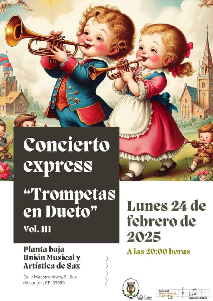 El próximo lunes 24 de febrero a las 20:00 horas en el salón multiusos de la planta baja del local social de la Unión Musical y Artística de Sax, tendrá lugar un nuevo concierto express organizado por el aula de trompeta de nuestra escuela.