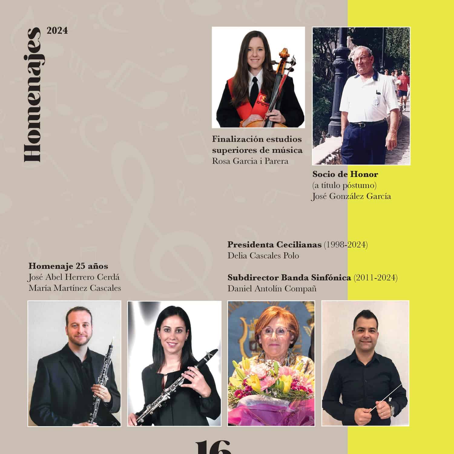 Al inicio de la segunda parte tendrán lugar los homenajes anuales de la entidad sajeña. Se homenajeará a Rosa Garcia por la finalización de sus estudios superiores de música; a José Abel Herrero Cerdá y María Martínez Cascales, por sus 25 años como componentes de la banda; a Delia Cascales Polo por la finalización de su etapa como Presidenta de la Agrupación de Cecilianas tras 27 años; a Daniel Antolín Compañ por sus 13 años como subdirector de la banda; y a José González García como Socio de Honor a título póstumo.