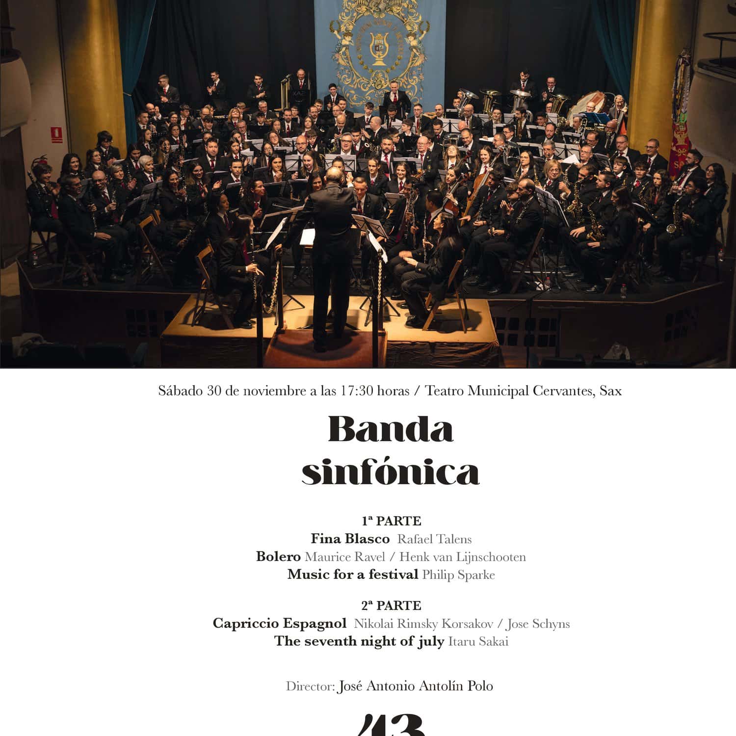 Bajo la batuta de su director, José Antonio Antolín, la agrupación musical interpretará en la primera parte las siguientes obras: «Fina Blasco» de Rafael Talens, «Bolero» de Ravel y «Music for a festival» de Philip Sparke. Asimismo, en la segunda parte se escuchará «Capricho español» de Rimsky Korsakov y «The Seventh Night of July» del compositor Itaru Sakai.