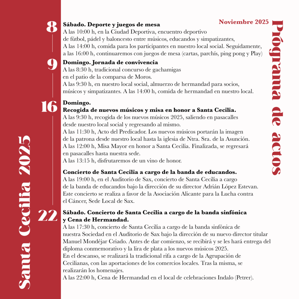 Empieza noviembre y se aproxima la festividad de nuestra patrona, Santa Cecilia. Estos son los actos que hemos organizado y nos encantaría que nos acompañaseis.