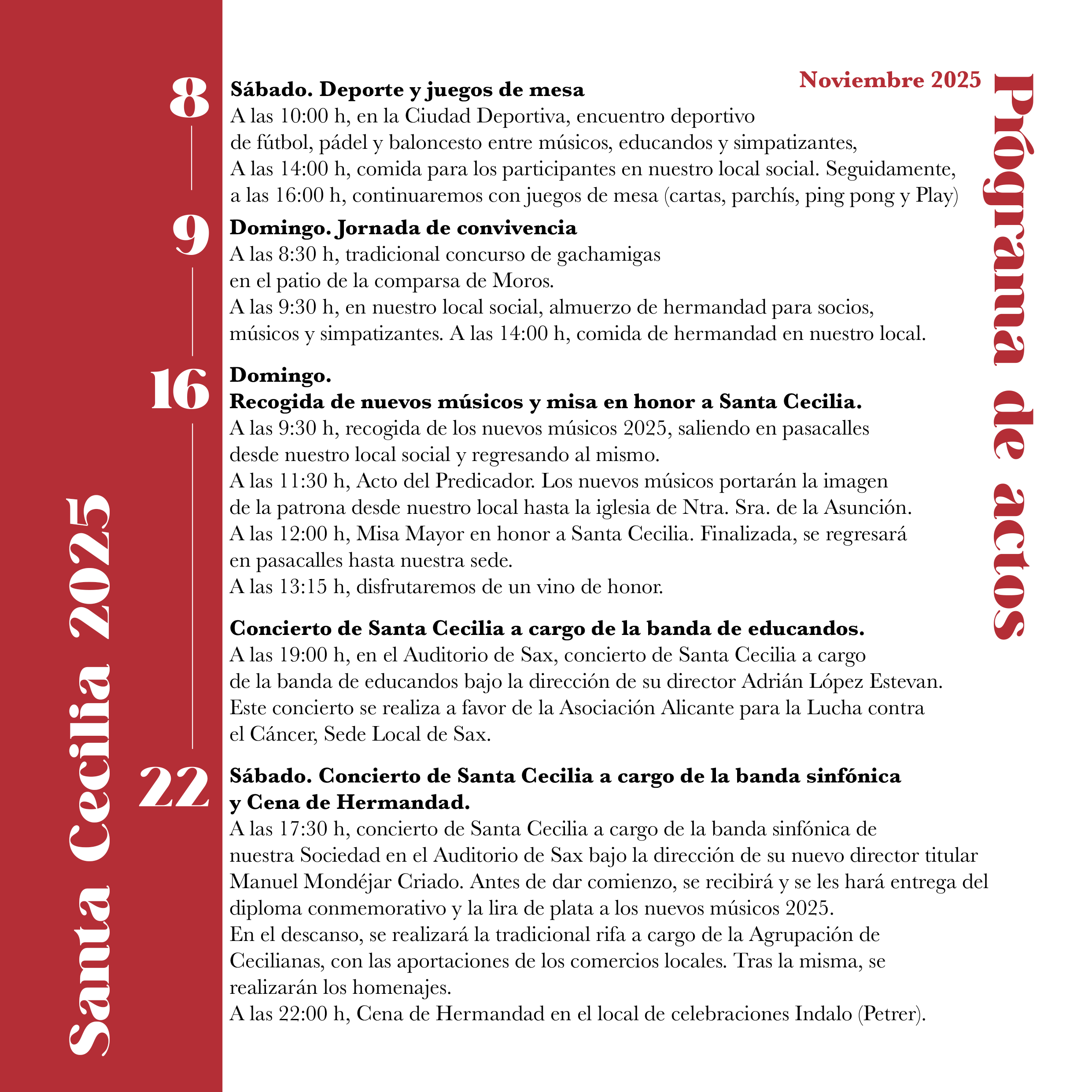 Empieza noviembre y se aproxima la festividad de nuestra patrona, Santa Cecilia. Estos son los actos que hemos organizado y nos encantaría que nos acompañaseis.