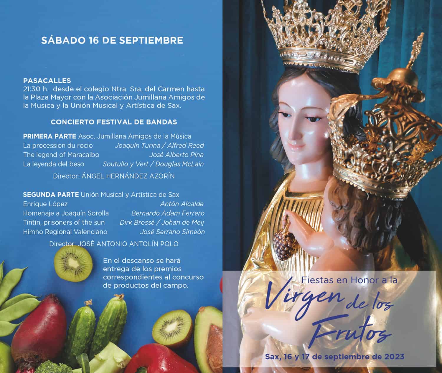 La Unión Musical y Artística de Sax celebrará el próximo sábado 16 de septiembre a las 22:00 horas en la Plaza Mayor de Saxel tradicional festival de bandas dentro de la festividad en honor a la Virgen de los Frutos, organizado por el Ilmo. Ayuntamiento de Sax.
