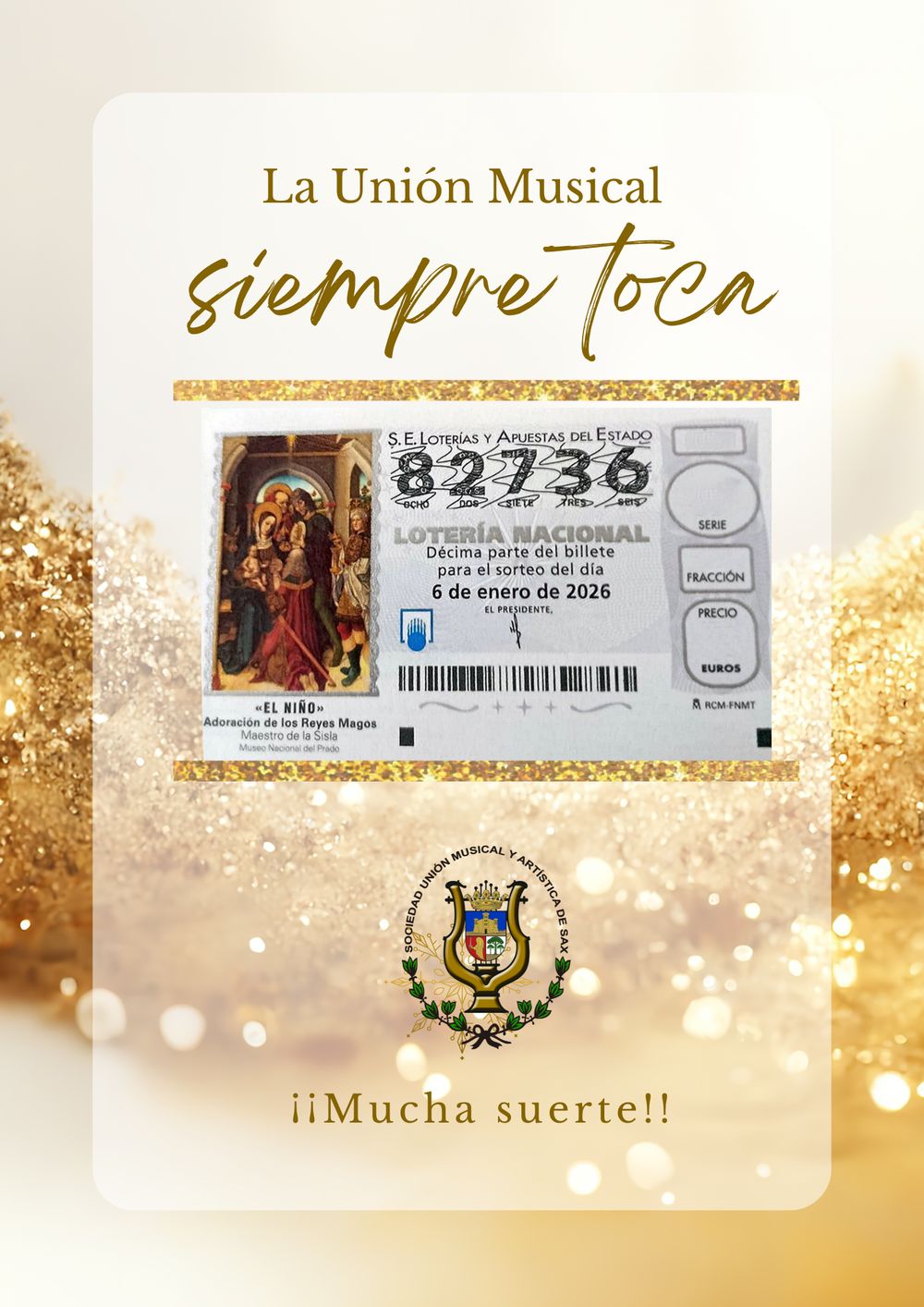 12 de diciembre de 2025 La Unión Musical de Sax siempre toca… ¡y esta Navidad puede tocarte a ti! Hazte con tu décimo de lotería para el sorteo del Niño y apoya a tu banda de música. Contacta con cualquiera de nuestros directivos. Compártelo por redes Compartir en X (Twitter) Compartir en Facebook Compartir en WhatsApp Compartir en Telegram